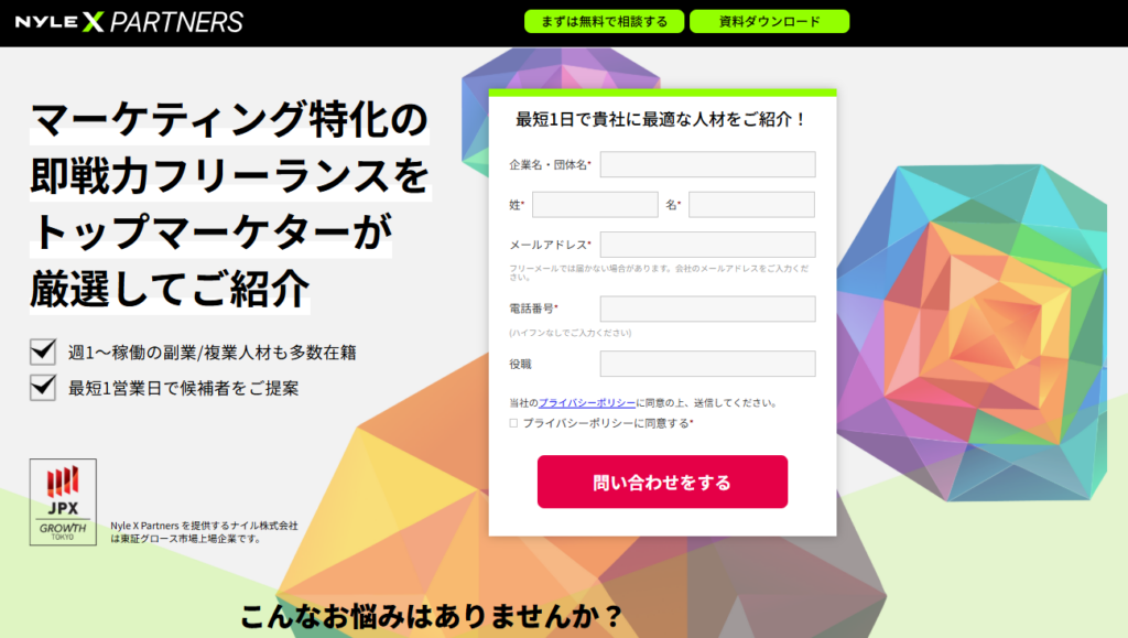 Nyle X Partners(ナイル株式会社)は、2,000社以上のマーケティング支援実績を持つナイル株式会社が提供する、人材マッチングサービスです。特にマーケティング領域に強みがあり、SEOや広告運用、CRM、コンテンツマーケティングなど、専門領域に強みを持つ即戦力プロ人材を企業に紹介しています。
